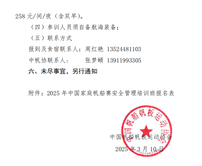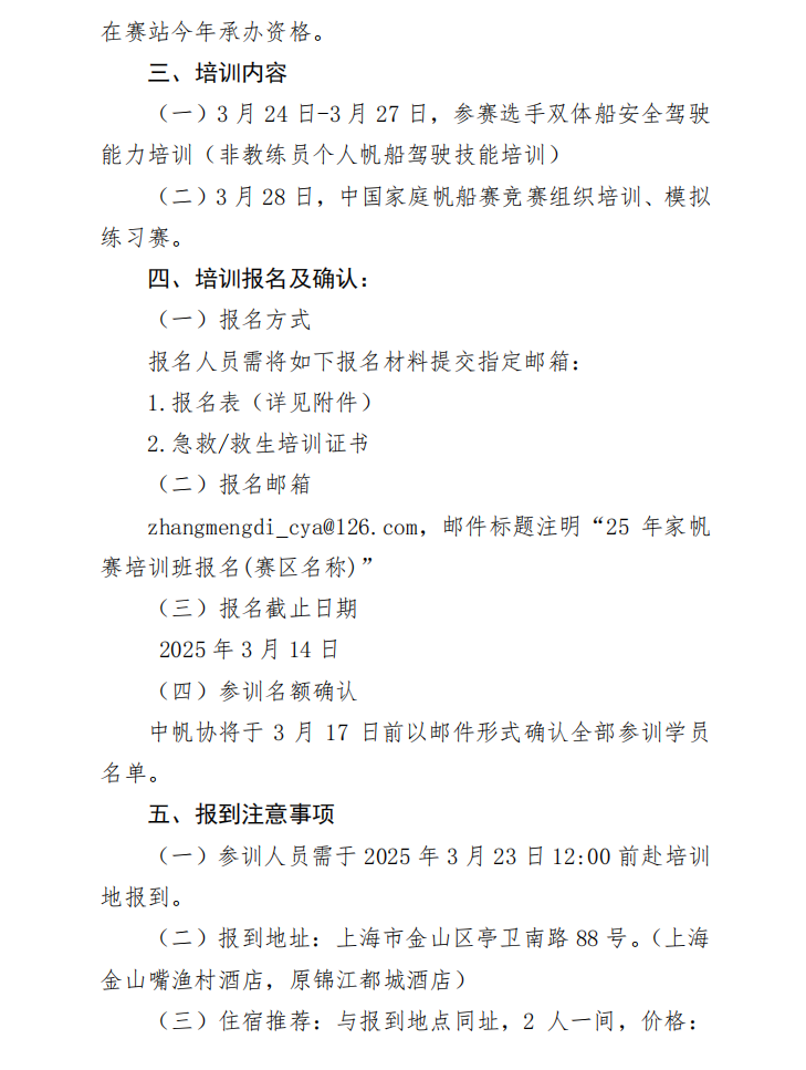 为加强中国家庭帆船赛各承办单位的组织水平与能力。中帆协计划于2025年3月24日至3月28日在上海金山区举办2025年中国家庭帆船赛安全办赛培训班,现将具体事宜函告如下:(二)以赛区为单位,每个赛区须委派1名负责今年赛事培训的帆船主教练参加。(三)参训人需持有效的国家或国际相关救生机构的救生培训结业证书(如报名时无法提供,最晚可于通过培训后60天内向中帆协提交)。(四)培训日最后一天将对所有参训人员进行考核,未通过考试的人员提供补考,如补考仍未通过,将可能影响所在赛站今年承办资格。(一)3月24日-3月27日,参赛选手双体船安全驾驶能力培训(非教练员个人帆船驾驶技能培训,)(二)3月28日,中国家庭帆船赛竞赛组织培训、模拟练习赛;(请点击左下角“阅读原文”下载查看附件,提取码:1234)zhangmengdi_cya@126.com,邮件标题注明“25年家帆赛培训班报名(赛区名称)”;中帆协将于3月17日前以邮件形式确认全部参训学员名单。(一)参训人员需于2025年3月23日12:00前赴培训地报到;(二)报到地址:上海市金山区亭卫南路88号(上海金山嘴渔村酒店,原锦江都城酒店)(三)住宿推荐:与报到地点同址,2人一间,价格:258元/间/夜(含双早);附件:2025年中国家庭帆船赛安全办赛培训班报名表