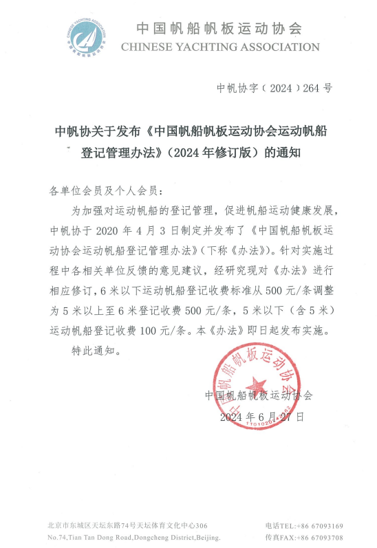 中帆协关于发布《中国帆船帆板运动协会运动帆船登记管理办法》(2024年修订版)的通知