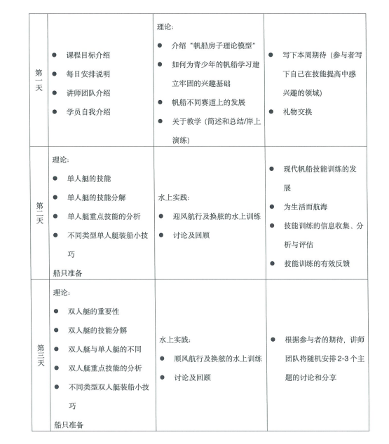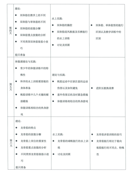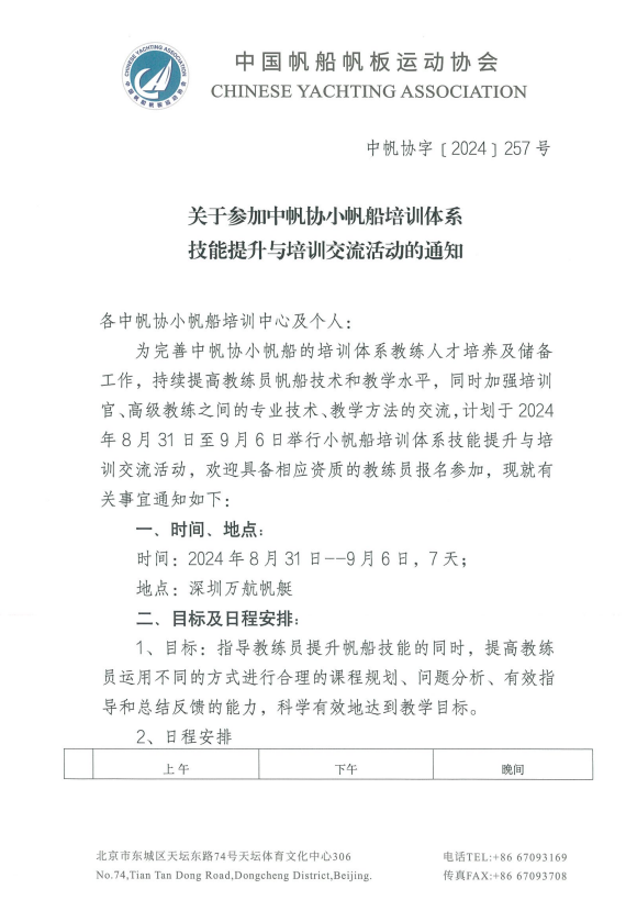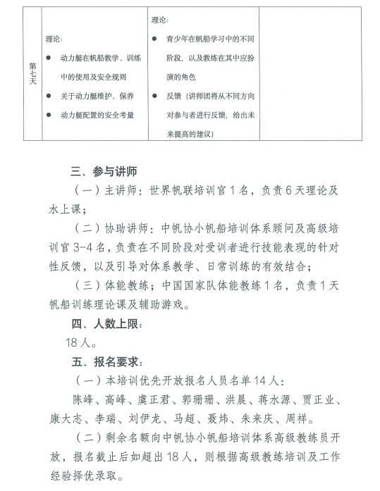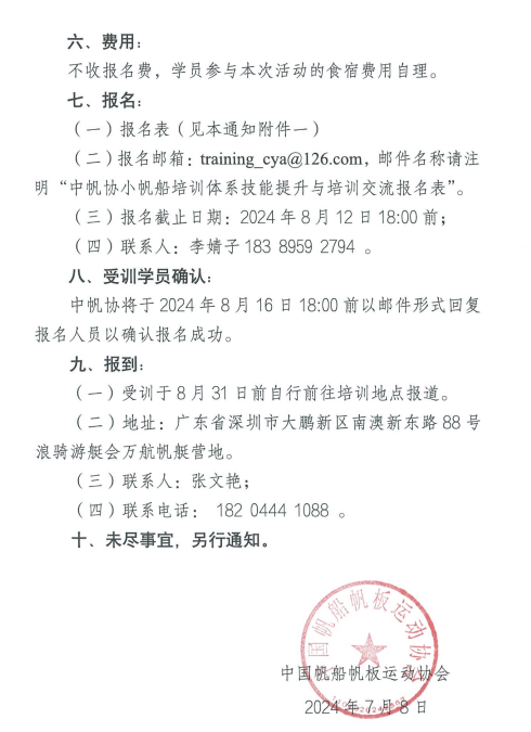 为完善中帆协小帆船的培训体系教练人才培养及储备工作,持续提高教练员帆船技术和教学水平,同时加强培训官、高级教练之间的专业技术、教学方法的交流,计划于2024年8月31日至9月6日举行小帆船培训体系技能提升与培训交流活动,欢迎具备相应资质的教练员报名参加,现就有关事宜通知如下:1、目标:指导教练员提升帆船技能的同时,提高教练员运用不同的方式进行合理的课程规划、问题分析、有效指导和总结反馈的能力,科学有效地达到教学目标。(一)主讲师:世界帆联培训官1名,负责6天理论及水上课;(二)协助讲师:中帆协小帆船培训体系顾问及高级培训官3-4名,负责在不同阶段对受训者进行技能表现的针对性反馈,以及引导对体系教学、日常训练的有效结合;(三)体能教练;中国国家队体能教练1名,负责1天帆船训练理论课及辅助游戏。陈峰、高峰、虞正君、郭珊珊、洪晨、蒋水源、贾正业、康大志、李瑞、刘伊龙、马超、聂炜、朱来庆、周祥。(二)剩余名额向中帆协小帆船培训体系高级教练员开放,报名截止后如超出18人,则根据高级教练培训及工作经验择优录取。(点击左下角“阅读原文”下载查看附件,提取码:1234)(二)报名邮箱:training_cya@126.com,邮件名称请注明“中帆协小帆船培训体系技能提升与培训交流报名表”。(三)报名截止日期:2024年8月12日18:00前;(四)联系人:李婧子183 8959 2794 。中帆协将于2024年8月16日18:00前以邮件形式回复报名人员以确认报名成功。(二)地址:广东省深圳市大鹏新区南澳新东路88号浪骑游艇会万航帆艇营地。