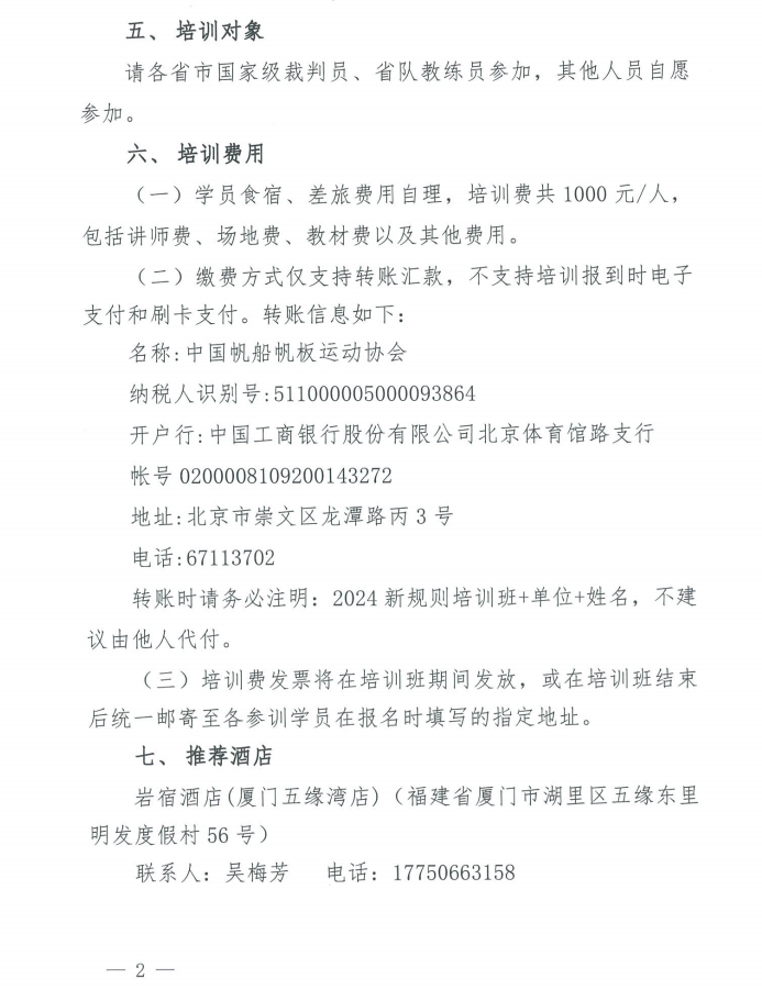 国家体育总局青岛航校、各省(区、市)帆船项目管理中心,会员协会、会员俱乐部,各有关人员:为提高我国帆船帆板项目对新周期规则的理解和运用能力,促进我国帆船运动发展和竞技水平的提高,中国帆船帆板运动协会将于2024年10月28-30日在福建厦门举办2024年帆船帆板新规则培训班。培训班邀请世界帆联规则委员会委员授课,现将有关事宜通知如下:10月28日报到,29日-30日帆船规则讲解及案例分析请各省市国家级裁判员、省队教练员参加,其他人员自愿参加。(一)学员食宿、差旅费用自理,培训费共1000元/人,包括讲师费、场地费、教材费以及其他费用。(二)缴费方式仅支持转账汇款,不支持培训报到时电子支付和刷卡支付。转账信息如下:纳税人识别号:511000005000093864转账时请务必注明:2024新规则培训班+单位+姓名,不建议由他人代付。(三)培训费发票将在培训班期间发放,或在培训班结束后统一邮寄至各参训学员在报名时填写的指定地址。岩宿酒店(厦门五缘湾店)(福建省厦门市湖里区五缘东里明发度假村56号)学员专享预定价格:280元(普通标间/大床)320元(海景标间/大床)请各单位认真做好报名工作,于2024年9月30日17:00前进行报名,10月15日17:00前完成缴费,逾期不予办理。报名邮箱:tongwenyun_cya@126.com参加培训人员自备培训用品,包括笔记本电脑、帆船竞赛规则及其它用品等。(点击左下角“阅读原文”下载查看附件,提取码:1234)