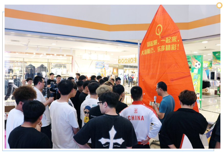 帆船静态展示:在大商锦州千盛购物广场四楼活动区摆放OP帆船模拟器,展示帆船的构造和特色,专业教练进行讲解。