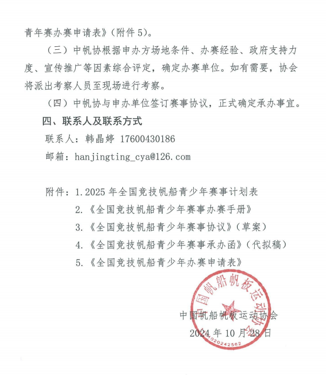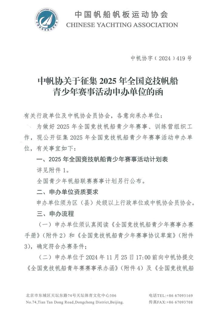为做好2025年全国竞技帆船青少年赛事、训练营组织工作,现公开征集2025年全国竞技帆船青少年赛事活动申办单位,有关事宜如下:申办单位须为区(县)处级以上行政单位或中帆协会员协会。(一)申办单位须认真阅读《全国竞技帆船青少年赛事办赛手册》(附件2)和《全国竞技帆船青少年赛事协议草案》(附件3),确定符合办赛条件;(二)申办单位于2024年11月25日17:00前向中帆协提交《全国竞技帆船青年赛赛事承办函》(附件4)及《全国竞技帆船青年赛办赛申请表》(附件5)。(三)中帆协根据申办方场地条件、办赛经验、政府支持力度、宣传推广等因素综合评定,确定办赛单位。如有需要,协会将派出考察人员至现场进行考察。(四)中帆协与申办单位签订赛事协议,正式确定承办事宜。邮箱:hanjingting_cya@126.com (报名表请点击左下角“阅读原文”下载查看附件,提取码:1234)附件1