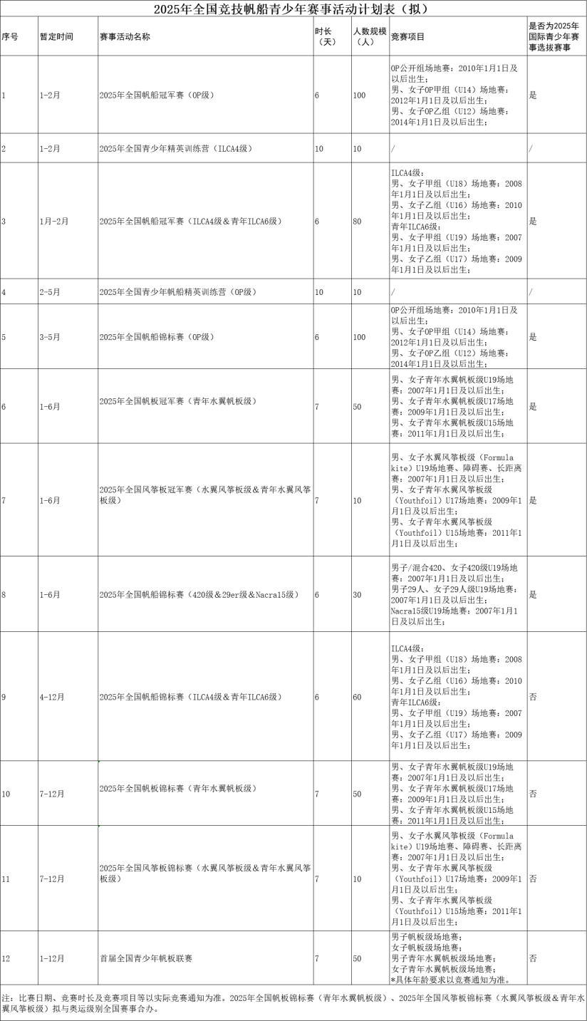 2025年全国竞技帆船青少年赛事活动计划表(拟)