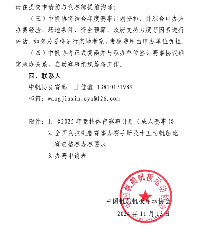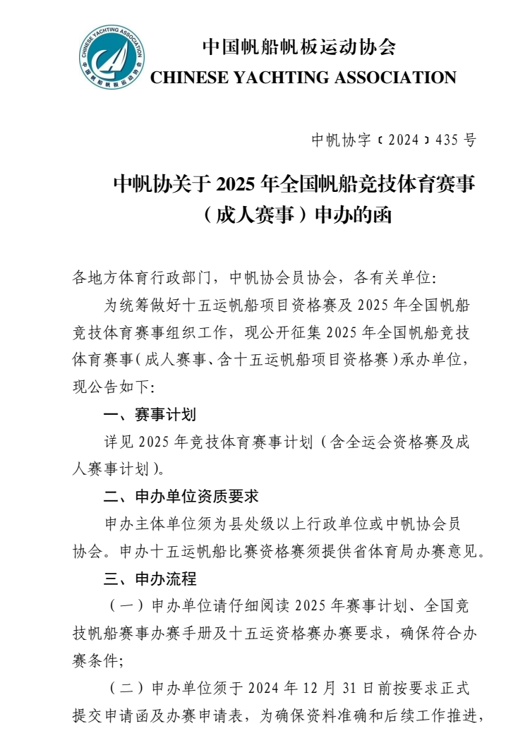 为统筹做好十五运帆船项目资格赛及2025年全国帆船竞技体育赛事组织工作,现公开征集2025年全国帆船竞技体育赛事(成人赛事、含十五运帆船项目资格赛)承办单位,现公告如下:详见2025年竞技体育赛事计划(含全运会资格赛及成人赛事计划)。申办主体单位须为县处级以上行政单位或中帆协会员协会。申办十五运帆船比赛资格赛须提供省体育局办赛意见。(一)申办单位请仔细阅读2025年赛事计划、全国竞技帆船赛事办赛手册及十五运资格赛办赛要求,确保符合办赛条件;(二)申办单位须于2024年12月31日前按要求正式提交申请函及办赛申请表,为确保资料准确和后续工作推进,请在提交申请前与竞赛部提前沟通;(三)中帆协将结合年度赛事计划安排,并综合申办方办赛经验、场地条件、资金预算、政府支持力度等因素进行评估。如有必要将进行实地考察,考察费用由申办单位负担。(四)中帆协将正式复函并与承办单位签订赛事协议确定承办关系,启动赛事组织筹备工作。邮箱:wangjiaxin_cya@126.com附件: (请点击左下角“阅读原文”下载查看附件,提取码:1234)2. 全国竞技帆船赛事办赛手册及十五运帆船比赛资格赛办赛要求