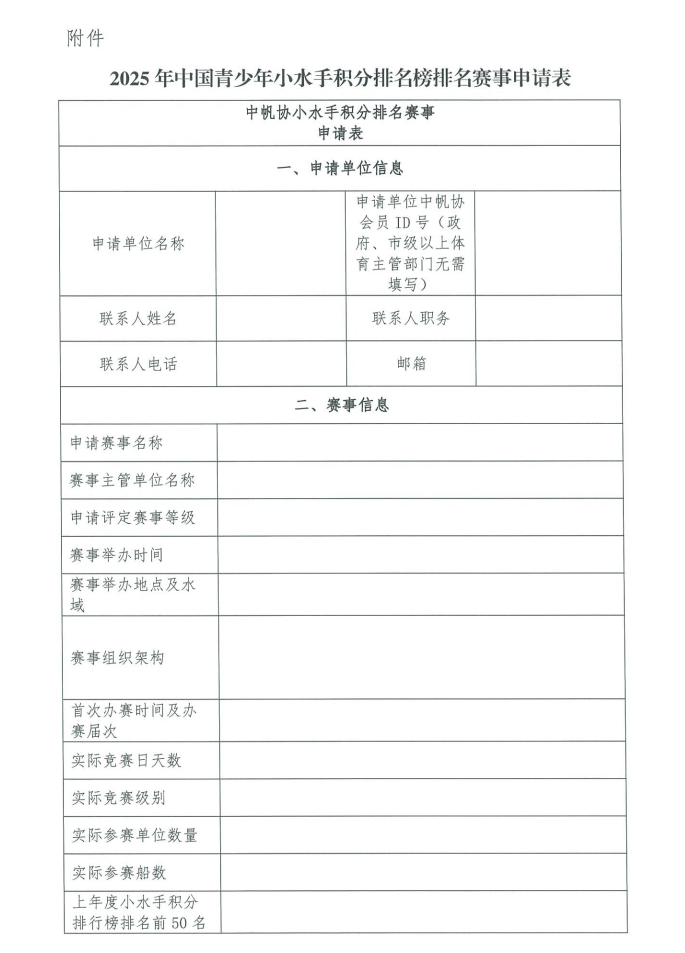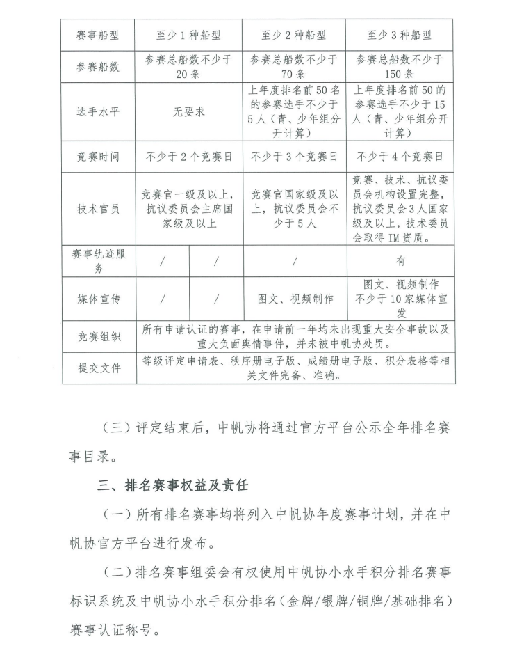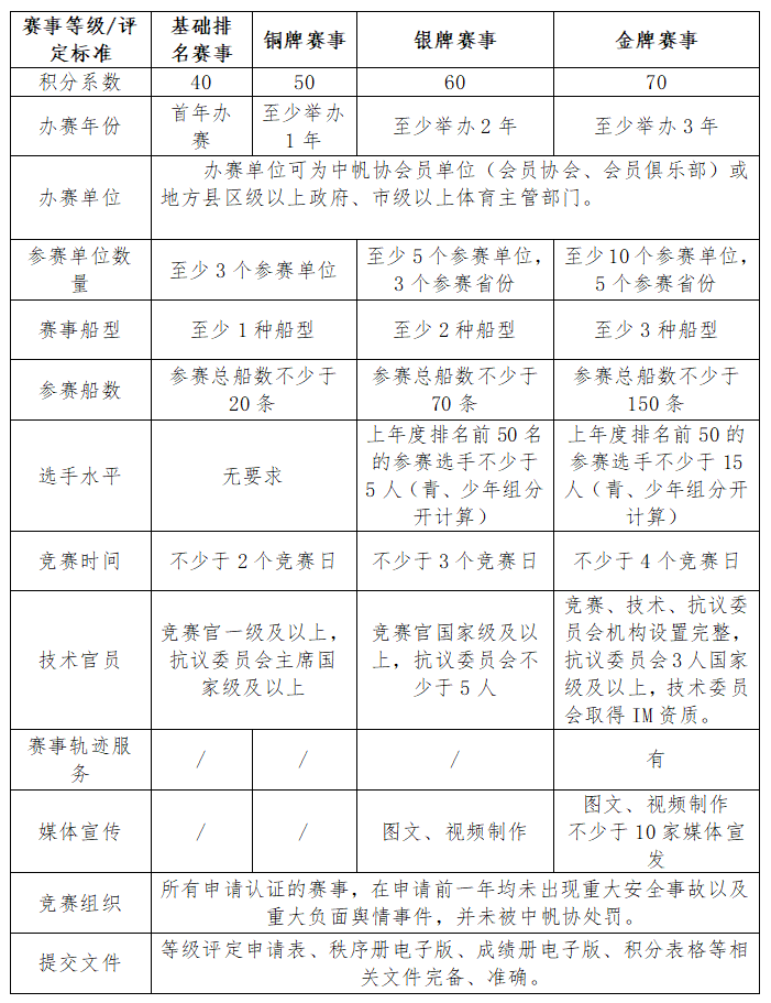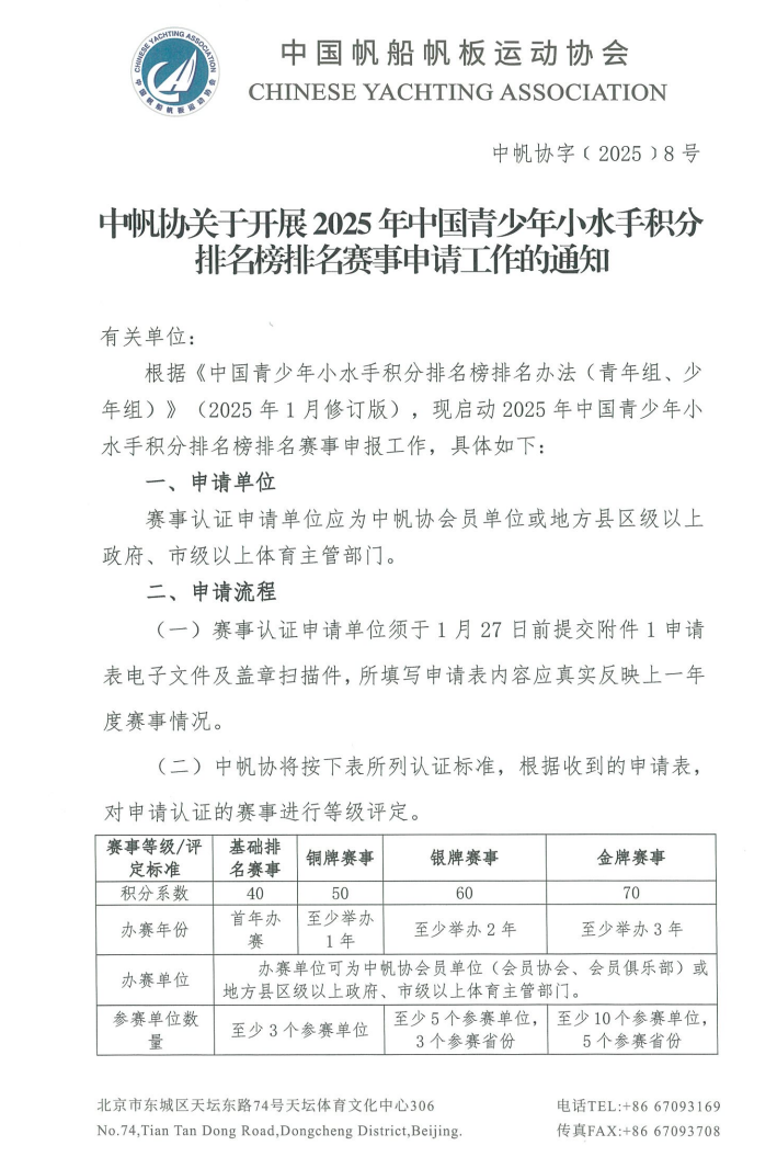 根据《中国青少年小水手积分排名榜排名办法(青年组、少年组)》(2025年1月修订版),现启动2025年中国青少年小水手积分排名榜排名赛事申报工作,具体如下:赛事认证申请单位应为中帆协会员单位或地方县区级以上政府、市级以上体育主管部门。(一)赛事认证申请单位须于1月27日前提交附件1申请表电子文件及盖章扫描件,所填写申请表内容应真实反映上一年度赛事情况。(二)中帆协将按下表所列认证标准,根据收到的申请表,对申请认证的赛事进行等级评定。