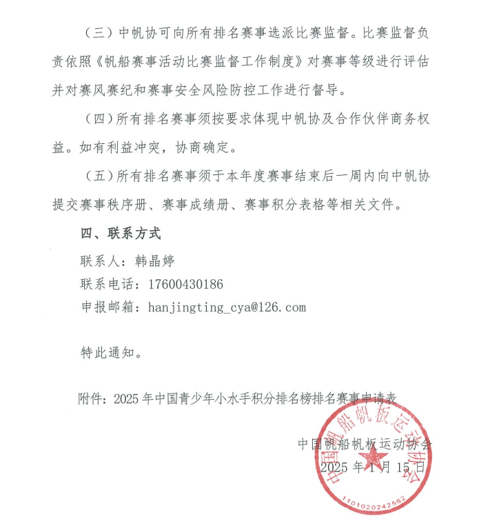 (三)评定结束后,中帆协将通过官方平台公示全年排名赛事目录。(一)所有排名赛事均将列入中帆协年度赛事计划,并在中帆协官方平台进行发布。(二)排名赛事组委会有权使用中帆协小水手积分排名赛事标识系统及中帆协小水手积分排名(金牌/银牌/铜牌/基础排名)赛事认证称号。(三)中帆协可向所有排名赛事选派比赛监督。比赛监督负责依照《帆船赛事活动比赛监督工作制度》对赛事等级进行评估并对赛风赛纪和赛事安全风险防控工作进行督导。(四)所有排名赛事须按要求体现中帆协及合作伙伴商务权益。如有利益冲突,协商确定。(五)所有排名赛事须于本年度赛事结束后一周内向中帆协提交赛事秩序册、赛事成绩册、赛事积分表格等相关文件。申报邮箱:hanjingting_cya@126.com附件:2025年中国青少年小水手积分排名榜排名赛事申请表(请点击左下角“阅读原文”下载查看附件,提取码:1234)