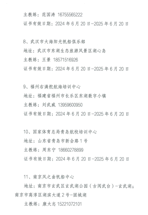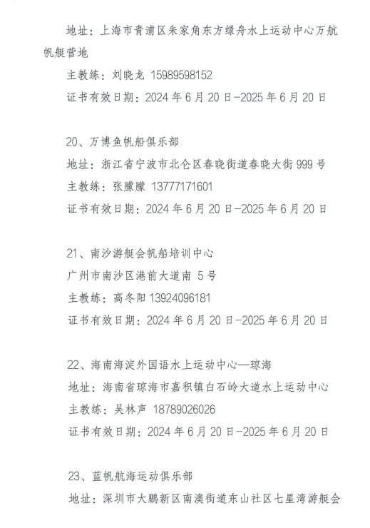 根据2024年中帆协小帆船培训体系培训中心的年审工作计划,于2024年6月20日完成27家培训中心检查,共有27家培训中心通过检查,1家新培训中心完成认证,培训中心名单如下:证书有效日期:2024年6月20日-2025年6月20日证书有效日期:2024年6月20日-2025年6月20日证书有效日期:2024年6月20日-2025年6月20日证书有效日期:2024年6月20日-2025年6月20日地址:河北省秦皇岛市海港区秦港四公司维修队机械一队(院内)证书有效日期:2024年6月20日-2025年6月20日地址:河北省秦皇岛市抚宁区夏威夷大道一杯澜浴场英洋航海俱乐部证书有效日期:2024年6月20日-2025年6月20日证书有效日期:2024年6月20日-2025年6月20日证书有效日期:2024年6月20日-2025年6月20日证书有效日期:2024年6月20日-2025年6月20日证书有效日期:2024年6月20日-2025年6月20日地址:南京市玄武区玄武湖公园(古阅武台)-玄武湖;南京市高淳区湖滨大道2号-固城湖证书有效日期:玄武湖:2024年6月20日-30日;2024年9月1日-2025年6月20日;固城湖:2024年7月1日-8月31日地址:江苏省南通市崇川区崇川大道紫琅湖路紫琅公园5号停车场向北150米证书有效日期:2024年4月1日-2025年4月1日地址:浙江省宁波市鄞州区东钱湖镇环湖南路775号逸帆航海俱乐部证书有效日期:2024年6月20日-2025年6月20日证书有效日期:2024年6月20日-2025年6月20日证书有效日期:2024年6月20日-2025年6月20日地址:苏州市吴江区太湖新城东太湖生态园南门尚赛帆船培训中心证书有效日期:2024年6月20日-2025年6月20日地址:上海市奉贤区海湾旅游区海涵路6号碧海金沙内(东侧)证书有效日期:2024年6月20日-2025年6月20日证书有效日期:2024年6月20日-2025年6月20日地址:上海市青浦区朱家角东方绿舟水上运动中心万航帆艇营地证书有效日期:2024年6月20日-2025年6月20日证书有效日期:2024年6月20日-2025年6月20日证书有效日期:2024年6月20日-2025年6月20日证书有效日期:2024年6月20日-2025年6月20日证书有效日期:2024年6月20日-2025年6月20日地址 :深圳市大鹏新区南澳街道大鹏游艇会深圳陈锦浩证书有效日期:2024年6月20日-2025年6月20日广东惠州市惠东县稔山镇合正东部湾游艇会佛罗伦萨会所一楼证书有效日期:2024年6月20日-2025年6月20日深圳市南山区沙河街道滨海大道2008号欢乐海岸椰林沙滩证书有效日期:2024年6月20日-2025年6月20日地址:广东省深圳市大鹏新区南澳街道88号浪骑游艇会证书有效日期:2024年6月20日-2025年6月20日证书有效日期:2024年6月20日-2025年6月20日